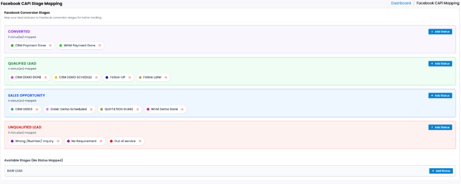 1. Choose which lead status updates in VSCRM should be sent to Meta (like “Qualified Lead” or “Closed Lead”).